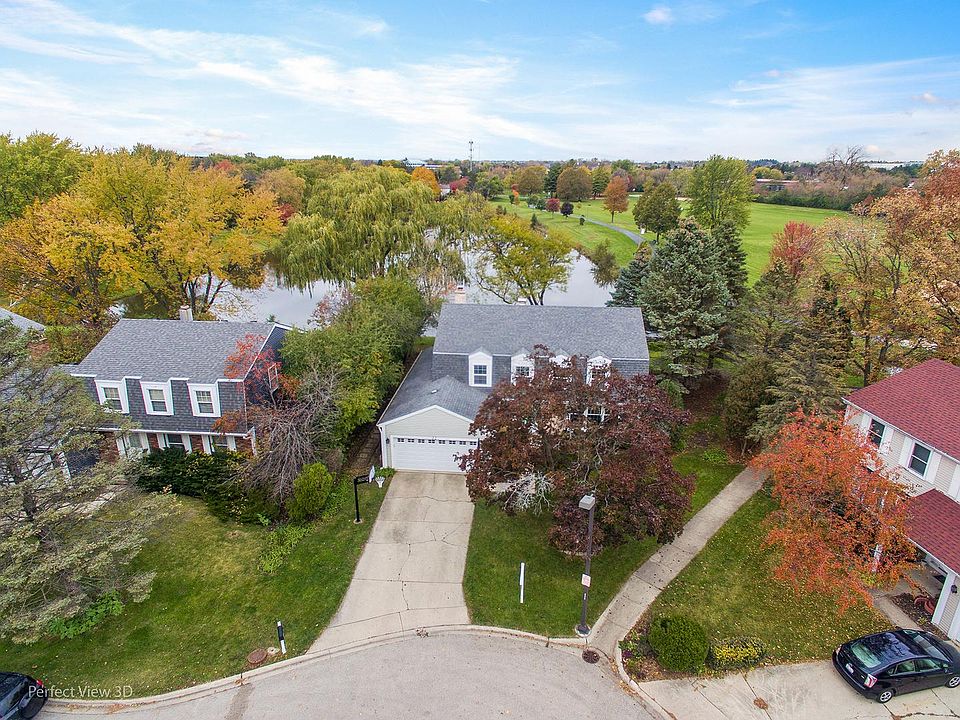 Located in much sought after Deerpath subdivision and nestled on a premium cul de sac lot with tranquil WATER VIEWS, you will want to call this warm and inviting "home" yours! Located on golden pond and next to the park affords much privacy and beautiful views from your oversize multi level deck. This spacious 4 bedroom/ 2.1 bath home has been lovingly cared for with updated light fixtures, neutral carpet (upstairs) ,fresh neutral paint, white colonist doors / trim. Hardwood floors flow through most of the main living area as you step into the foyer and enter your lovely large living room flooded with natural sunlight. Separate dining room adjoins sunny living room with expansive views of pond and is perfect for entertaining or sharing everyday meals. Updated Kitchen boasts plenty of cabinet space, pantry, granite counters, eating area with windows overlooking yard and pond. Cozy Family room with recess lights, fireplace and french doors that open out to deck and yard. Upstairs boasts Primary suite with updated spa shower, dual vanity, walk in closet. 3 additional generous size bedrooms. Part finished basement with tile flooring , acoustic tile ceiling, crawl. Attached 2 car garage. Sit back and relax on your multi level deck with unobstructed views of the pond where nature abounds! Invisible Dog fence. This low traffic location can't be beat ~ all within minutes of Schools, library, restaurants, train, shops, entertainment and interstate access. Updates include 2 furnaces , 2 air conditioners '10 , carpet '17, back up sump '18,