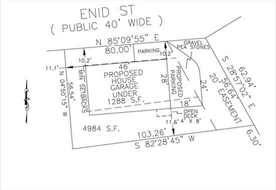 Paved public street with water and sewer. Trees cleared. Lot corners marked and land survey plan done. Nice lot with easy highway access. CITY zoning Approval in hand to build a up to 28x46 home with 1 car garage under. Underground Sewer Easement along left side of lot so house should be built to right. Parking ok on easement.