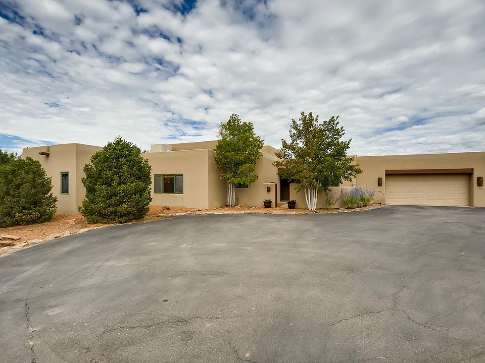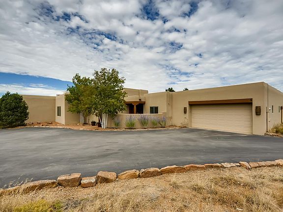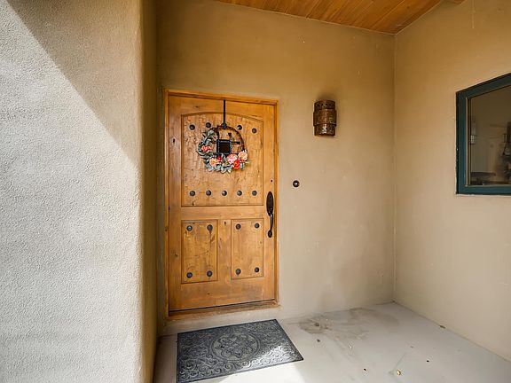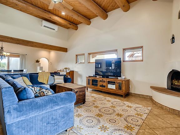 Enter this beautiful custom single story home through the gates flanked by whispering aspens! The spacious living room, dining room, and kitchen areas are open and inviting with high ceilings with Vigas and a kiva fireplace. The kitchen has upgraded appliances (Samsung & Bosch) and a breakfast bar. There is tile in the living areas and carpet in the bedrooms, with Radiant heat (NOT KITEC) and split A/C and Evaporate cooling. The walled backyard is inviting with grass and mature trees and the large portal with a kiva fireplace is perfect for entertaining. The paved driveway leads right into the large oversized garage and there are a shared well.