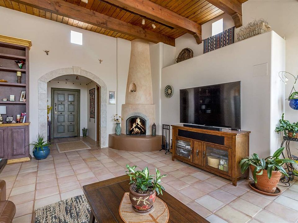 Gorgeous home with expansive views, Refinished kitchen cabinets. Newer refrigerator, microwave oven, water heater. Newer carpeting in two bedrooms and newer blinds in master bedroom and kitchen/dining. Master bedroom with walk in closet and cheerful living room which has vigas and kiva fireplace. The kitchen offers natural wood cabinets, a cooking island and built-ins. There is also a separate pantry. The dining area has magnificent mountain views and doors to the flagstone patio and garden with a water feature. Finally there are faux finishes which enhance the splendor of this special home. This home will not disappoint.