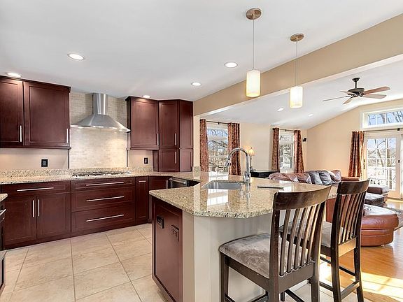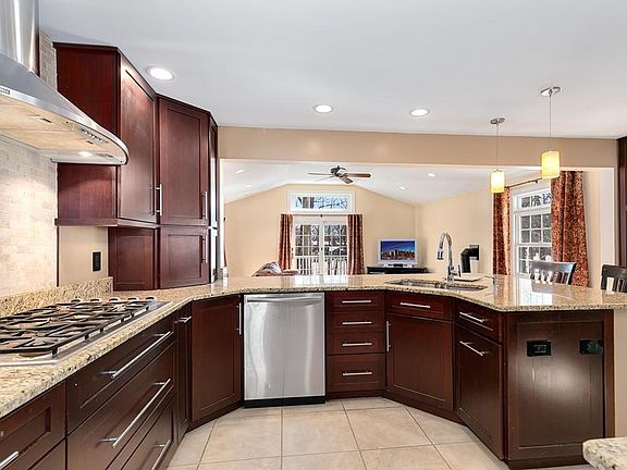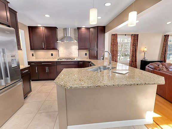 - Kit Dscrp: Countertops - Stone/Granite/Solid, Flooring - Stone/Ceramic Tile, Breakfast Bar / Nook, Kitchen Island, Stainless Steel Appliances, Open Floor Plan, Recessed Lighting, Gas Stove, Lighting - Pendant