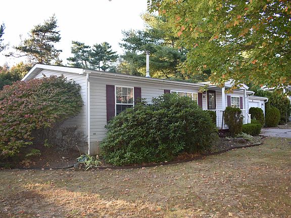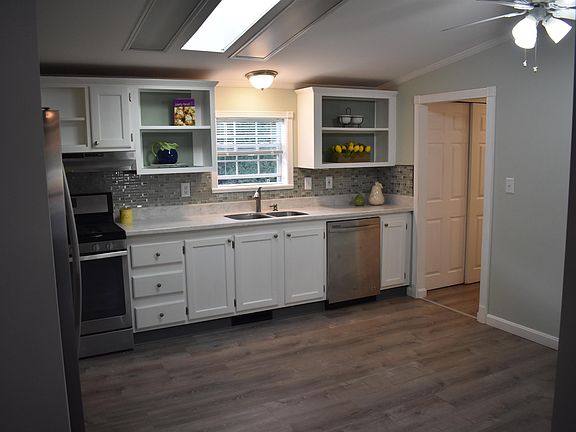 Bright and welcoming 1995 manufactured home offering an open floor plan and comfortable one-level living. The spacious eat-in kitchen boasts abundant cabinetry and open shelving, stainless steel appliances, skylights, and a convenient pass-through to the living room. A large picture window and ceiling fan highlight the inviting living area. The primary suite includes a generous closet and private bath with a walk-in shower. Two additional bedrooms share a full hall bath with a large vanity and tub. Added conveniences include a full-size washer and dryer, extra storage closet, and an attached garage with direct entry. Located in a desirable 55+ park close to shopping, dining, and local amenities!