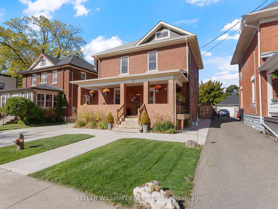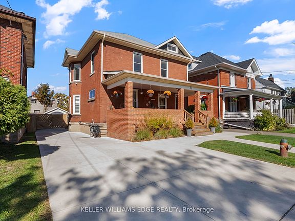 Step into timeless charm and modern convenience at 22 Griffith Street, nestled in Welland's vibrant Downtown core. This stunning all-brick 2.5-storey home sits on an impressive 43 x 116 ft lot and offers a rare combination of character, space, and thoughtful updates including all windows, siding, eaves troughs, down spouts and garage roof all completed in 2024. Featuring 4 exceptionally generous bedrooms, a luxurious renovated full bath on the upper level, convenient 2-pc bath on the main floor, and a roughed-in bath in the basement with a separate entrance - this home offers comfort and flexibility for families or multi-generational living. The formal living and dining rooms are perfect for entertaining, while the covered front veranda, spanning the width of the home (25ft wide), invites morning coffee or evening relaxation in true classic style. Enjoy the benefits of natural gas forced air heating and central A/C - not common in homes of this vintage. Renovated throughout from top floor to main, the pride of ownership shines inside and out. The detached 1-car garage and pristine concrete driveway provide parking for up to 7 vehicles. Step out back to a fully fenced yard with a deck and garden shed - ideal for families, pets, and gatherings. A short stroll to the Welland Canal, Market Square, Merritt Park Amphitheatre, downtown shops, and seasonal events. Easy access to public transit and highways. A truly special home where heritage meets lifestyle. Nothing is under contract - move in and enjoy from day one!
