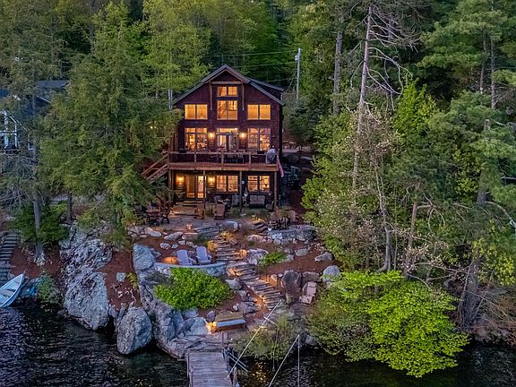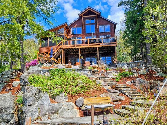 22 Harris Road offers sought-after south and west exposures and sunset views on a premium shoreline on Lake Winnipesaukee. The waterfront is beautifully improved with terraced landscapes and hardscapes including a lakeside gas fire pit, ample sitting areas, gentle stone stairs, low-voltage lighting, permanent deep-water dock, kayak storage, and a sandy bottom cove with clear waters for swimming. The setting is protected, buffered by Stonedam Island, while also providing easy access to the broad part of the lake for boating, and to the amenities of downtown Meredith. Designed by Bensonwood, known for quality and efficiency, and built by renown custom builder Hayward & Company, this modern timber frame home blends contemporary luxury with a timeless lakefront charm. Exposed beams, cathedral ceilings, and expansive windows frame the water views and fill the home with natural light. The great room features a floor-to-ceiling stone gas fireplace and Russian birch hardwood floors, opening to a chef’s kitchen with custom granite and high-end appliances. The first-floor primary suite allows for one-level living. Upstairs, there is a large bedroom and bunk room, each with their own ensuites. A finished lower level with walk-out to the lake features a rec area with wet bar, “bonus room” and bath. Central air, two furnaces, and a whole-home generator, provide comfort and assurance year-round. Offered largely furnished (list available by request). Shown by appointment only, please.