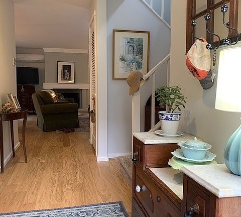 Rare and picturesque townhouse overlooking a beautiful small pond and babbling brook. This 2 BR, 1.5 BA, end unit with 1,365' sf of living space has recently undergone many upgrades. The living and dinning rooms are combined to form an open floor plan with a fireplace and double sliders leading out to a patio that overlooks a very private and serene pond. Engineered hardwood floors were just installed throughout the entire main level, new hot water heater, the entire unit was freshly painted with earth toned colors, the kitchen has newer cabinets, stainless steel appliances, new light fixtures and granite countertops. Both bathrooms underwent entire updating, all the windows and sliders were replaced with double pane thermo insulated glass. In addition to the installation of baseboard heating units there are 3 LG Mini Split units providing energy saving heating and cooling. Farmington Woods is a gated community with a 18-hole Championship USTA golf course with a full-service restaurant & clubhouse, tennis, paddleball, and pickleball courts, swimming pools, community gardens, miles of sidewalks for safe walking and jogging. The monthly HOA is $474.58, Xfinity cable/internet is $54.19, Minimum restraurant is $35, and the Quarterly district tax is $508.27.
