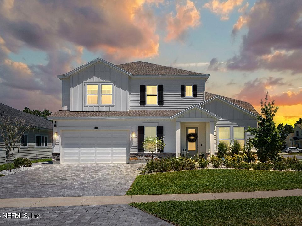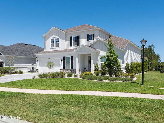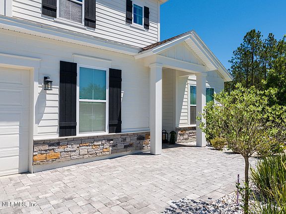 Welcome to your dream home in Nocatee, ideally situated on an expansive 75ft wide lot on a quiet cul-de-sac road! This spacious and beautifully designed home boasts over 3,100 sq ft of living space with 5 bedrooms, 4 full baths, an office, and a versatile bonus room. The bright, open-concept layout features abundant living areas and stylish finishes throughout. A bright foyer welcomes you into the heart of the home, leading to the spacious kitchen with large island, dining nook and spacious living room! The gourmet kitchen provides plenty of space for large family meals, holiday entertaining or cooking culinary delights. The luxurious master suite provides wonderful private natural light in a spacious retreat. The master bathroom is complete with dual sink vanity, large walk-in shower and spacious closet space. Upstairs provides three additional bedrooms including a large en suite bedroom. The expansive office/flex room includes a built-in counter space with beverage refrigerator and a huge closet/storage room for all your storage needs. The bonus room with built-in electric fireplace provides a great space for a media room, playroom or teen lounge! Step outside to a huge screened-in, paver lanai with a built-in fire pit, ideal for relaxing or entertaining, all overlooking a large backyard with plenty of room for a pool. The expanded paver driveway leads to a large 2.5 car garage that includes a Tesla charger as well as plenty of space for vehicles and a golf cart to enjoy the Nocatee lifestyle! Enjoy resort-style living with access to Nocatee's award-winning amenities just minutes from the beach, shopping, and top-rated St Johns County schools!