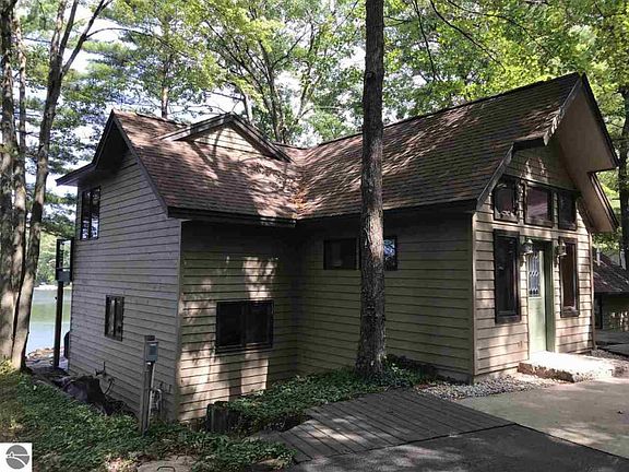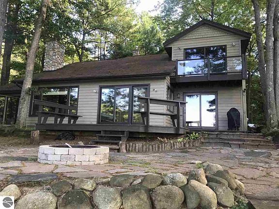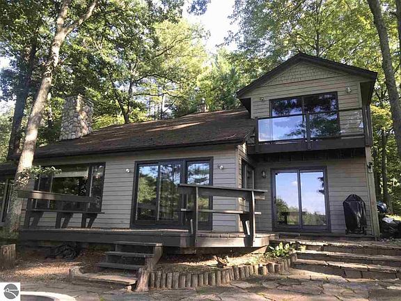 Beautiful and spacious contemporary home on High Lake just 7 miles southeast of Traverse City. High Lake is a stream fed, all sports lake offering clear water and a sandy bottom. Towering trees surround the property and provide plenty of shade with a classic "Up North" feel. Remodeled kitchen has a large working island with granite countertop. First floor master suite has doorwall to lake, private full bath and WIC. Upstairs bedroom and loft with balcony overlooking lake. Great Room has new engineered luxury vinyl flooring (2018). Cathedral ceilings finished with tongue and groove pine detail and a large fieldstone fireplace provide a warm rustic charm. New Flagstone patio and fire pit (2016) adjacent to wood deck and waterfall pond. Newer furnace and A/C (2014). Large 2.5 car garage. Walking distance to Grace McDonald Park, a premier park in the county. Great property at an attractive price. All furnishings/equipment negotiable.