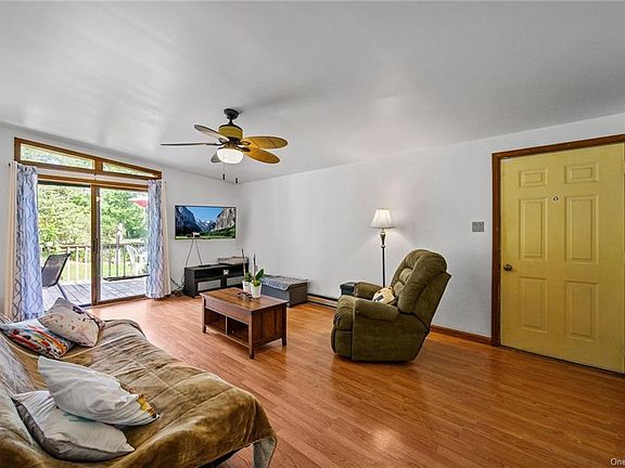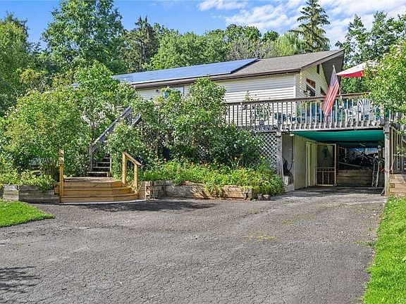 Surrounded by 2.7 acres of perennial & annual gardens, flowering shrubs and tall stately trees, embrace the tranquility and quiet of this bright, spacious 3 Bedroom/2 Bath ranch-style Contemporary home, located near the end of a private road, yet only minutes from 9W. Built by its current owner, the home is designed for comfort, safety, and energy efficiency. Every room has its own climate control system, the attic and finished basement are completely insulated, all windows are triple thermal paned, skylights brighten the house even on cloudy days and the leased Tesla solar panels operate on their own breakers. Pick your outdoor spot to relax on any one of three lighted decks, take a dip in the above ground pool, or cozy up in the winter when the wood burning stove is fired up. New tile and bathroom fixtures, nearly new kitchen appliances & solid wood cabinets, beautiful laminate floors, and tons of storage options make this home an exceptional value.