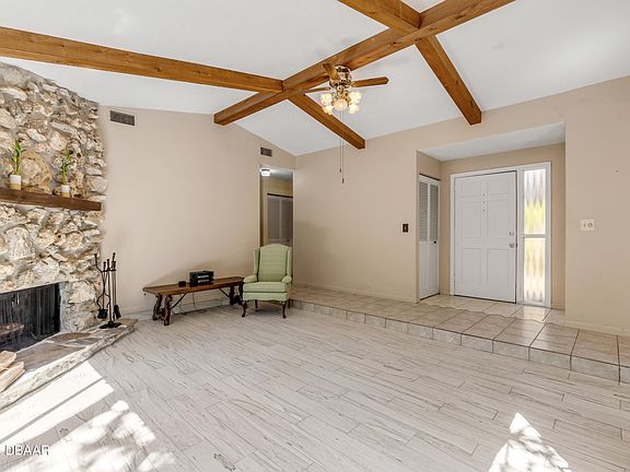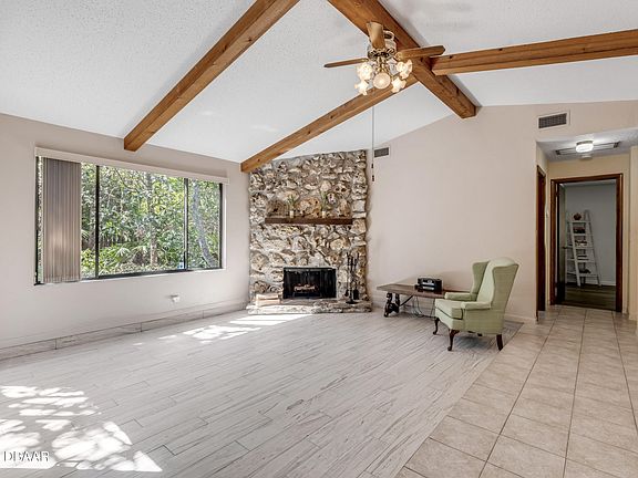 Welcome to your serene oasis in Ormond Beach! This charming 2-bedroom, 2-bathroom townhome provides 1,260 sq ft of comfortable living space, nestled at the end of a quiet cul-de-sac for added privacy. Enjoy the convenience of being just moments away from local restaurants, shopping, and a short drive to the stunning beaches of Ormond and Daytona. Enter through your private, fenced courtyard, where you'll be greeted by the inviting warmth of a wood-burning fireplace and soaring vaulted ceilings adorned with beautiful wood beams. The kitchen is a chef's delight, featuring solid wood cabinets and sleek stainless steel appliances. The primary bedroom boasts an en suite bathroom complete with a spacious vanity and shower, perfect for your personal retreat. Outside, unwind on your private fenced-in rear patio, ideal for relaxation or entertaining. The desirable community amenities include a refreshing pool, clubhouse, and tennis courts. Don't miss out on this incredible opportunity!