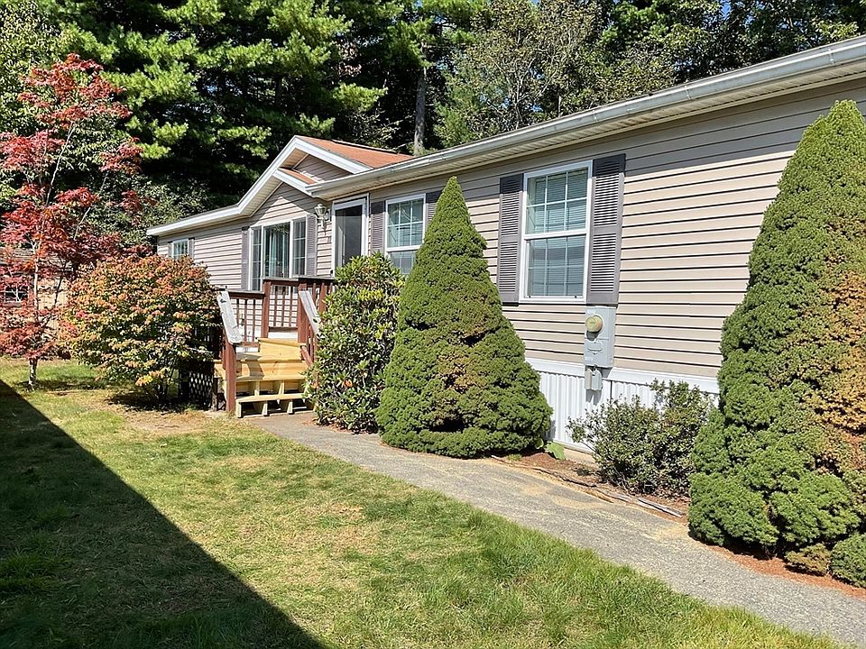 Mogan's is a respected FAMILY PARK (no age restriction). Unit built 8-16-2004 and is ready for quick closings. This double wide mobile/manufactured home has one of the best lots/sites in the park as the last house on the street. Besides the wooded side and rear views, the paved 'turnaround' lends itself to overflow parking when available. Front lawn has just been re-seeded. The side porch & rear deck were just rebuilt, and a brand new double door shed from Reeds Ferry will be installed before closing. Appealing floorplan offers a primary bedroom on one end of the house with a private bath (featuring seated shower, double vanity and soaking tub), while the other 2 bedrooms and bath are on the opposite end giving privacy. All 3 bedrooms feature walk-in closets. Washer & dryer are conveniently located in the mudroom rather than the bath. No wall to wall carpeting here! Heating updated 2 yrs ago. New dishwasher. Appliances stay. Corner dining room hutches can remain.