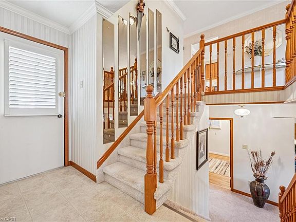 Welcome to 22 Myrtleville Drive, located in a sought-after, family-friendly neighbourhood. Here is your opportunity to own a well-maintained, meticulously clean, smoke and pet-free raised bungalow home that has been loved by the original owners. Bordering on the peaceful and scenic grounds of the Myrtleville House Museum. Step inside from the front porch to find a spacious foyer - the perfect place to welcome friends and family. Inside entry to the garage is handy feature. The upper level offers an open concept living/dining room, and a bright and well-appointed kitchen. The primary bedroom is at the back of the home with a view of mature trees and the fenced backyard. Two more bedrooms, one presently used as a den/sitting room. Downstairs you will find a large recreation room with gas fireplace and custom built-in cabinetry for plenty of storage. Custom California shutters on the windows at the front of the house. There is a large 2-pc bathroom on this level that was once a home salon (plumbing available). Updates include: dishwasher (2025), water softener (2025), basement flooring (2023), kitchen & 3rd bedroom windows (2020), Driveway paved (2014), roof (2014). Walk to Walter Gretzky Municipal Golf Course and it's new lawn bowling greens. Quick drive to many useful amenities. Great location for commuters - the Paris Road & Highway 403 exit is 3 minutes from your front door, as well as Highway 24 to the North.