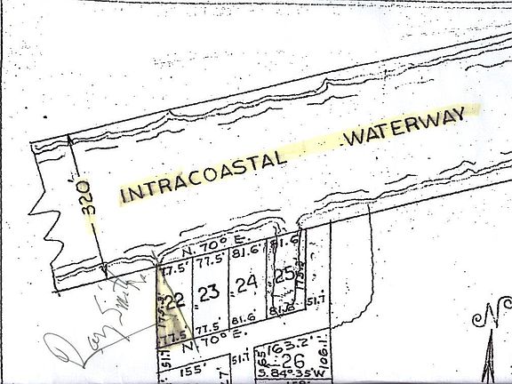 Lot fronting the Intracoastal Waterway at one point and next to the Robert Edge Parkway. Public water is available for purchase separately, and public sewer is four lots down on second Avenue South. Have an engineer help you find out how much to bring public sewer to this lot before you think about purchasing it.