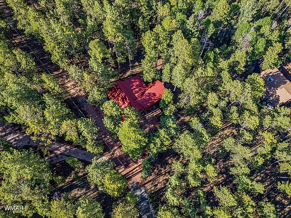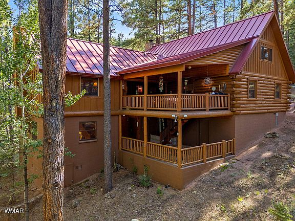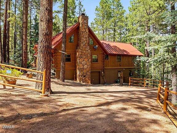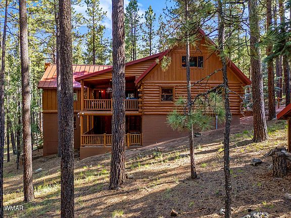 Insulated but not isolated, this impeccably maintained (main cabin is full log) cabin is nestled among tall pines at the very end of the road with approximately 270 ft. that borders the Apache Sitgreaves National Forest. Enjoy pristine vistas of a beautiful Aspen stand from your very private covered patio. Lower level is perfect for home office, artist studio or recreation room for children. Many upgrades including 13K back up generator, seamless metal roof and additional storage in lower garage level.