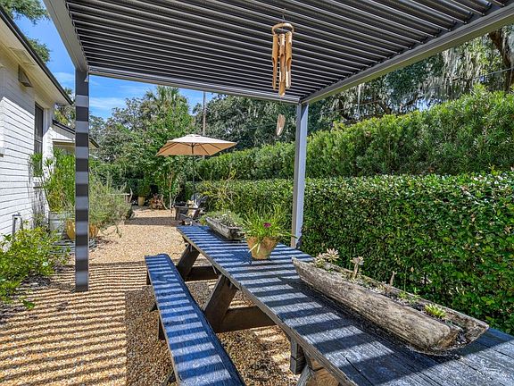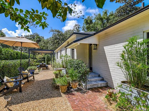 Nestled in the heart of historic St. Augustine's coveted landmark Nelmar Terrace neighborhood, this classic 1941 brick home has been meticulously renovated reflecting an elevated, timeless style using the finest of finishes. Tucked behind lush privacy hedges overflowing with fragrant jasmine, the al fresco dining area has the feel of a relaxing Tuscan villa. There's an oversized antique farm table under a pergola, zinc Koi ponds, soothing water features, and gorgeous greenery. Towering centuries-old oaks provide lovely shade across the corner lot. Inside, the stunning kitchen is the star of the show. A wall of hand-glazed tiles imported from Turkey creates a marvelous backdrop for the stainless 36" Heston gas range and hood. Island seating for six and an open floor plan means the chef never misses out on the fun. Curated spaces for conversation, entertaining and quiet reading, a working fireplace, cozy den, three large bedrooms, and three stunning bathrooms reflect the thoughtfulness of the updates. The European feel continues in the backyard which boasts absolute privacy, a pool with water feature, potted olive trees and pretty bougainvillea on the spacious patio finished with leathered blue marble pavers. A wall of French doors on the pool house (air conditioned) gives even more options for entertaining guests, hosting fabulous parties, or utilizing the space for a secluded office, yoga room or dedicated workout area. Nelmar Terrace is beloved for its old growth oaks dripping with Spanish moss. Friendly residents enjoy chatting on their morning and evening strolls, wide streets are perfect for leisurely bike rides, historic St. Augustine's city center isn't too far, and Vilano Beach's sunrises over the Atlantic Ocean or boat launch are only minutes away. This home has never flooded. The complete renovation in 2020 included new roof, all new windows, new exterior doors (while retaining the original front door with working mail slot) and updated electrical system. This simply stunning home is ready for its next owners to continue its legacy. For additional property details, please check unbranded property website at https://www.22nelmar.com/mls/156608581