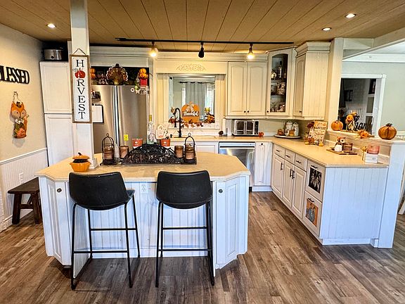 Welcome to this updated ranch-style home! It offers 4 spacious bedrooms and 2 full baths with an open concept layout designed for comfort and convenience. The kitchen features a built-in electric range, stainless steel appliances, and overlooks the bright living and dining area, making it ideal for gatherings. A cozy family room with wood-burning stove and built-ins creates the perfect retreat for chilly evenings. The primary suite is a true standout with its barn board accent wall, private bath with soaking tub, and separate shower. Three additional bedrooms provide plenty of space, with one offering its own private area complete with a walk-in closet/office and sitting area. The second bathroom has an oversized tiled shower with niche for storage.