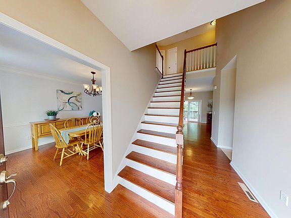 Crown moldingCenter islandGlass tile backsplashMahogany-stained oak hardwood floorsSpacious primary suiteFreshly painted dining roomChair rail