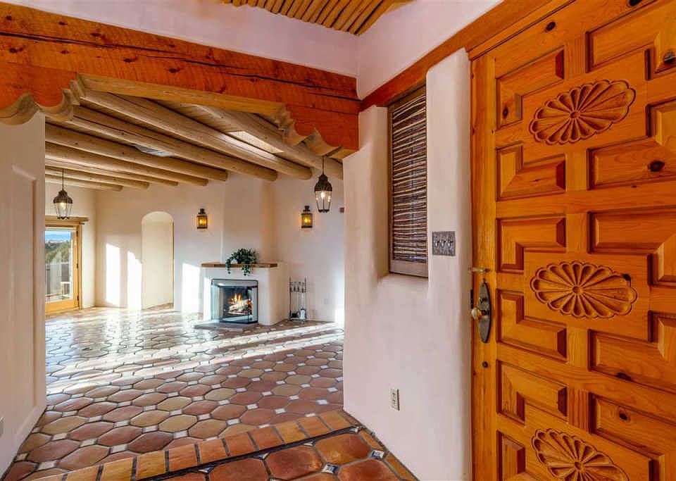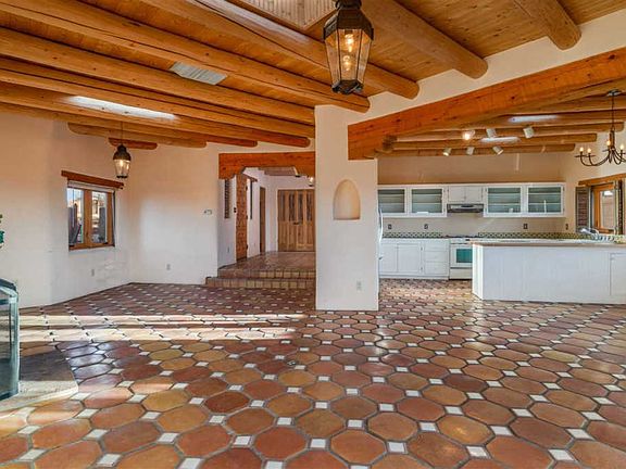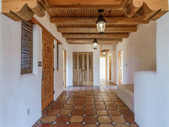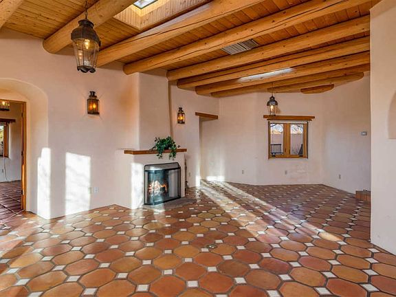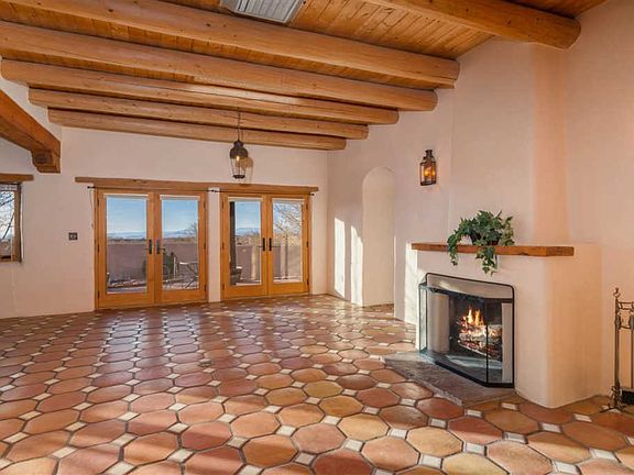 Quintessential adobe home in Eldorado. Enjoy beautiful sunset and Jemez mountain views from the main living areas of the home. Outdoor entertaining under your covered portal with the soothing sound of a waterfall in the yard. All of the custom features you would expect to find in your authentic adobe. Two wood burning fireplaces, custom design salitillo tile flooring, country kitchen, vigas and beam wood ceilings, private enclosed courtyard patio. The master bedroom suite has a kiva fireplace, with double doors to the patio. The master bathroom has a jetted tub and seperate shower and two closets. Enclosed area for pets. Detached storage building and double car garage.