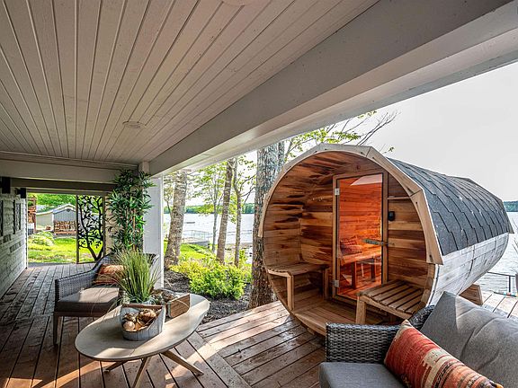 Welcome to 22 Parkview — Waterfrontage on Grand Lake This stunning home offers the feeling of living at your very own private resort—your perfect escape awaits. Beautifully landscaped front and back and wrapped in timeless Cape Cod wood siding, the property is designed for relaxation, entertainment, and luxury living. Step into the custom-built chef’s kitchen, complete with induction and gas cooktops, plus a double BBQ—ideal for hosting and cooking with a view. The kitchen flows seamlessly onto a spacious upper deck with stunning lake views. Beyond the elegant dining area lies the family and living space, filled with natural light pouring in from the lakefront windows. Just off this central living area, the custom-designed office offers built-ins and a full wall of windows—yet another space with incredible lake views, creating a peaceful and inspiring place to work. Outdoor living is next level with two expansive decks, a new dock with deep anchorage, and multiple fireplaces indoors and out. Unwind in the cedar-lined, electric-powered sauna, soak in the hot tub just off the main floor bedroom, or sip wine from your custom wine storage room—all while taking in the spectacular views and sunsets. This four-bedroom home includes two bedrooms with private ensuites, including the spacious primary suite, which features a walk-in closet and a luxurious bath. In-floor heating in the entryway and main floor bathroom adds warmth and luxury underfoot. The home is also wired with a back-up generator, ensuring peace of mind year-round. Book your private viewing today—there’s so much more to discover. Come see for yourself… you won’t want to leave!