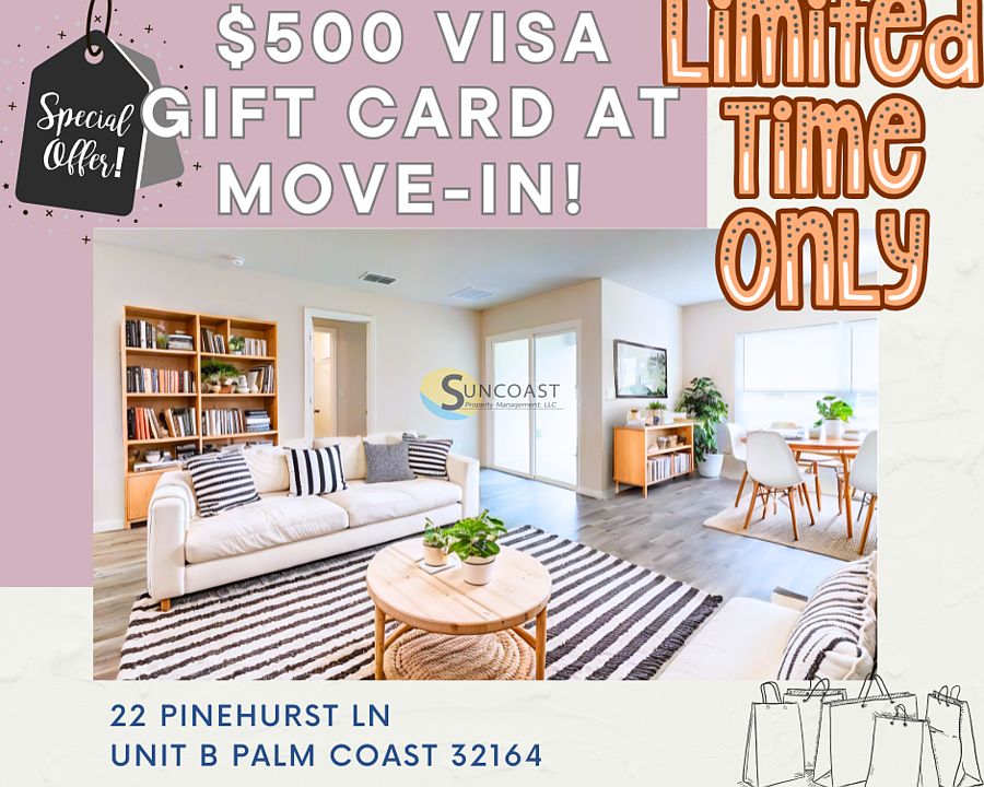 AWESOME PALM COAST LOCATION WITH A $500 VISA GIFT CARD! Just steps away from great Dining, Shopping, and Markets, convenience is right at your doorstep. Shout out Nature Lovers, there are trails within walking distance for weekend adventures or a peaceful morning! You can't go wrong with this CENTRAL LOCATION where you'll feel like you're in paradise every day! Located off of Palm Coast Pkwy, 95N and Old Kings Rd, commuting will be easy and fast! Embrace Your Space in this spacious and cozy 1287 sqft three-bedroom duplex home! Bring Life into this open-style floorplan where the sun will effortlessly shine through & provide a warm & bright welcome! You will have an attached car garage to suit private parking while providing additional storage. Walking inside, you are greeted by a foyer hall leading you to your cozy oasis. Large windows and sliding glass doors to your private patio brings in plenty of natural light to enjoy. A unique floorplan yet large furniture friendly with an area for a traditional dining set facing the windows. Whether a loud and spunky look is your style, or a simple and elegant look defines you, this space won't limit your creativity. The center kitchen is the focal feature! Deep cabinets and a center breakfast island makes for easy prepping or laid-back dining on take-out nights. You'll appreciate the attached 2-car garage and the convenience of washer and dryer connections, making laundry day a breeze. Whether you're working from home or just enjoying a cozy evening, this home has everything you need. * THIS HOME IS READY! APPLY TO SECURE! * * GET YOUR $500 VISA GIFT CARD AT MOVE-IN * Suncoast Property Management does require tenants to carry renter's insurance, with Suncoast Property Management listed as additionally insured. Proof of renter's insurance must be provided prior to the tenant's scheduled move-in. All SunCoast Property Management residents are enrolled in the Resident Benefits Package (RBP) for $75.00/month which includes liability insurance, credit building to help boost the residents credit score with timely rent payments, up to $1M Identity Theft Protection, HVAC air filter delivery (for applicable properties), move-in concierge service making utility connection and home service setup a breeze during your move-in, our best-in-class resident rewards program, on-demand pest control, and much more! The RBP is an additional cost and is not included in the advertised monthly rental rate. More details upon application. BE AWARE of potential fraud.Suncoast Property Management does NOT ask any of our potential residents to wire funds. Our main office is located in Jacksonville, Florida and you can visit our website to verify any rental listing. Photos are for illustration purposes only and some details may differ! Disposal Garage Pay Online Pets Allowed Views Washer/Dryer Connections