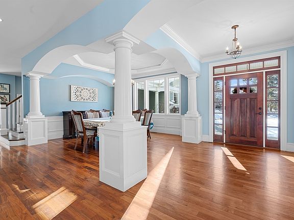 This young, custom built Colonial offers the perfect blend of classic design and modern living in a highly convenient south side location near top schools. Thoughtfully designed for today's lifestyle, the home features 4 spacious bedrooms plus multiple dedicated office and flexible spaces - ideal for remote work, study, or multi-generational needs. At the heart of the home, the open kitchen flows effortlessly into casual dining and a dramatic, vaulted double-height family room filled with natural light. Oversized windows overlook the expansive backyard and inviting hardscape with a firepit, creating an ideal setting for entertaining or relaxing year-round. The second floor features four well-appointed bedrooms along with a large office or flexible space over the garages, perfect as a home office, playroom or media room. The finished lower level offers high ceilings and exceptional bonus space,including a bar area, full bathroom, expansive game room,exercise room and additional storage.