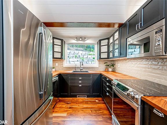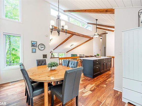 EXPERIENCE LUXURY LIVING AMIDST NATURE'S SPLENDOR: SPECTACULAR HOME WITH RESORT-LIKE AMENITIES AND STUNNING VIEWS! Nestled on a 77 x 267 ft private lot surrounded by towering trees, this impressive 2-storey home boasts proximity to Vettä Nordic Spa, Horseshoe Valley Ski Resort, various trails, and a 5-minute drive to three golf courses. Remarkable curb appeal welcomes you with a distinctive exterior, wood siding, recently upgraded expansive triple-pane windows (2023), and beautifully manicured gardens. Step inside to discover a spacious, well-maintained interior showcasing 2,646 finished sq ft of opulent living space. The main floor features hardwood floors, vaulted shiplap ceilings with wood beams, and a cozy sunken living room highlighted by a fireplace. The well-equipped kitchen offers gorgeous backyard views, a subway tile backsplash, and a large island with quartz and stainless steel appliances. Retreat to the primary bedroom with a 4-piece ensuite featuring a soaker tub. The finished basement exudes brightness and provides a main floor feeling thanks to expansive above-grade windows. Enjoy breathtaking views of the Horseshoe Valley ski resort from the comfort of your backyard sanctuary, reminiscent of a luxurious resort with approximately $150,000 spent on improvements. The backyard oasis is perfect for outdoor enthusiasts and avid gardeners alike, featuring a hot tub, composite deck shaded by an awning, an enclosed gazebo, a substantial armour stone retaining wall, a Dundalk sauna (2021), a playground, a fire pit area, and elevated garden beds. Additional features include a metal roof for added durability and peace of mind, an attached double-car garage, and ample parking space to accommodate up to 12 vehicles. Don't miss the opportunity to make this serene retreat your #HomeToStay!