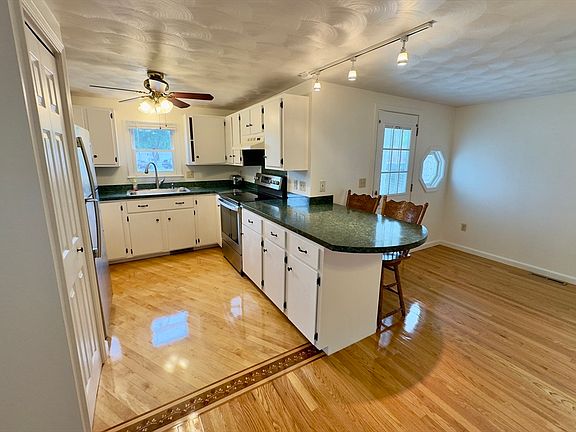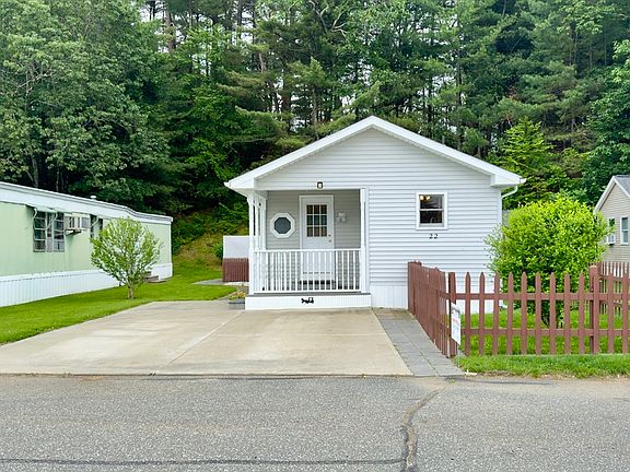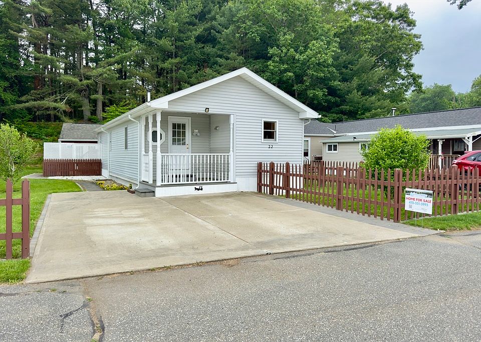 Welcome to Quaboag Valley Co-op! This well-maintained 1970 Richardson home lives like a small ranch with a 9'x42' addition, offering 878 sq. ft., 2 bedrooms, and 1 bath. Enjoy the inviting 8'x9' deck and a bright, open living room with gleaming hardwood floors and inlay design. The galley kitchen features stainless steel appliances and a large peninsula breakfast bar. A utility room provides laundry hookups, a newer water heater, and storage. Comfort is ensured with forced hot air heating, Miller oil furnace, and window A/C. Outside boasts three storage sheds (one with electricity), a freshly stained picket fence, and a new concrete driveway for two cars. $280/month lot fee includes water, sewer, trash, snow removal, and taxes—plus $14,000 co-op buy-in is included in the price. Move-in ready—schedule your showing today!