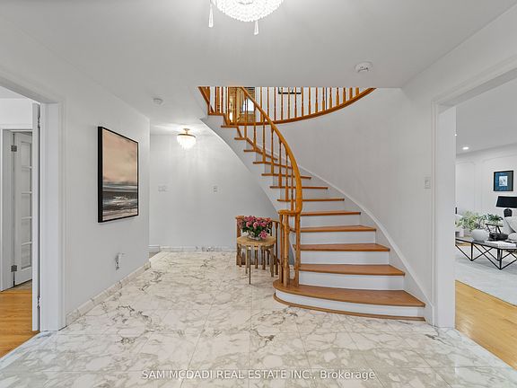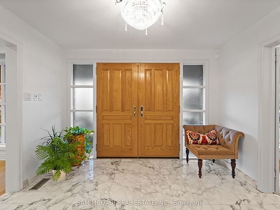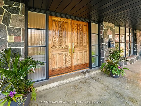 Welcome to 22 Richdale Court, a beautiful home at the end of a quiet court in Toronto's sought-after Princess-Rosethorn community. Perfect for families, this 3380 sqft above grade residence offers space, elegance, and an exceptional lifestyle. Step into the marble foyer, leading to separate formal living and dining rooms with large windows overlooking the landscaped front yard. The custom Cameo kitchen features granite floors and countertops, stainless steel appliances, backsplash, and a bright breakfast area with walkout to the expansive stone patio. The cozy family room offers cathedral ceilings, a stone fireplace, and large windows overlooking the backyard. Upstairs, the primary suite features a custom walk-in closet and 5-piece ensuite. Three additional bedrooms, a second 5-piece bathroom, and another large custom walk-in closet complete this level. The fully finished 1700+ sqft lower level includes a second kitchen, dining area, custom bar with carved wood counter and ambient lighting, den, 2 bedrooms, 1.5 bathrooms, sauna, and laundry. A separate walkout and ample storage make it ideal for rental income or multigenerational living. Outside, enjoy a beautiful backyard with a stone patio surrounded by mature trees, landscaped front and back yards, a covered porch, an updated 2-car garage, and a driveway for up to 8 cars. The brick and stone exterior enhances its timeless appeal. The home sits on an extraordinary pie-shaped lot - 37ft wide at the front, 182ft deep, expanding to 158ft at the rear. Located in Princess-Rosethorn, an upscale, family-focused neighbourhood, the home offers easy access to highways (401, 427), TTC routes, GO Transit, and top-rated public and private schools. Residents enjoy prestigious recreational amenities including St. George's Golf & Country Club and Islington Golf Club, plus nearby parks, trails, and shopping. 22 Richdale Court offers space, privacy, and outstanding family convenience in one of Toronto's most desirable communities.