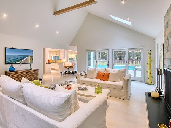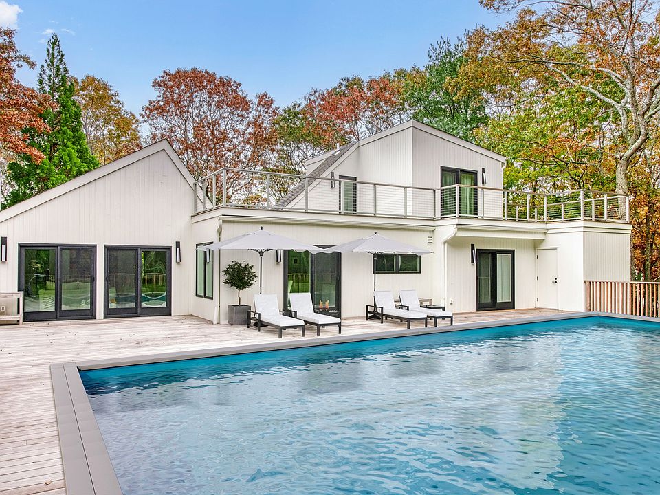 Travel down a long curving driveway to arrive at this dramatic turn-key modern residence that is well located in the nearby Northwest community of Heritage Hills, approximately five minutes by car from East Hampton Village and the ocean. Recently renovated with attention to detail by Profeta Architects, this private home on .8 acres has a 4 plus acre reserve to the west and a 3 plus acre parcel to the south. The light- filled living room with skylights, elevated beamed ceilings, stone fireplace and wall of glass opens directly to a new 2200 sf IPE deck, new outdoor spa, and new south facing heated 20x40 pool. The intimate dining area off the kitchen also has direct access to the out of doors. Cook to your hearts delight in this wonderful kitchen that any gourmet chef would love. Appliances include a Sub-Zero refrigerator, Wolf gas stove, and Miele dishwasher. Completing the main level are three well designed bedrooms, one with floor to ceiling windows and Zen- like views and another with ensuite bath and glass doors to the pool and spa. At the top of the stairs, you will find a roof-top IPE deck with incredible views, perfect for a private getaway to read a good book or to entertain friends. The spacious primary bedroom has its own outdoor terrace and bath. The legalized lower level has a fifth area perfect for a play space and has an additional recreation area with treadmill, Peloton bicycle, ping pong table, putting green and wine cooler. A few additional amenities include white oak floors, custom kitchen cabinetry, alarm, geothermal HVAC system, whole house dehumidifier, Hague water filtration system, irrigation system, Marvin and Anderson windows, modern pool, and deck lighting by Dazuma, and new LG washer and dryer. Landscaping is by Bayberry. This incredible home is perfect for the buyer with discriminating taste, especially those who have no time in their busy work schedule to renovate or decorate. Sold with all furnishings and accessories. Well priced at $2,745,000. Call for appointment.