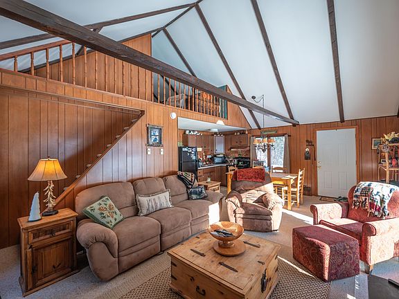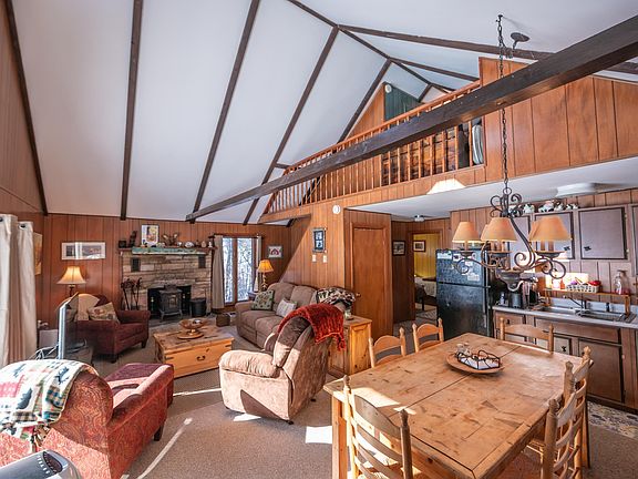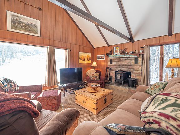 Charming vintage chalet with frontage on the Deerfield River, just north of the village of Wilmington and a short drive to Mount Snow. This idyllic home sits nestled on a dead end road with a private level lot, great natural light, and easy access. Inside you will find a meticulously maintained home straight from the 80s, with amazing vintage paneling, exposed wood beams on the vaulted ceiling, a large open concept living and kitchen space with wood stove and stone hearth, 2 spacious main floor bedrooms and a tiled full bath, a sleeping loft upstairs with half bath for easy nighttime use, a full finished walkout lower level with family room, laundry room, ample space for games, and a 4th bedroom that does not have legal rental egress. Overall a tremendous opportunity for a quaint Vermont getaway without the crazy price of competition. New well pump in 2022. Roof est 2018. Septic est 2014.