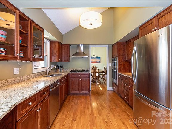 Gorgeous well maintained contemporary in quiet north Asheville NH close to the Country Club of Asheville. This property has a large 1.73 acre site, with home nestled into the woods. Main level features hardwood floors, native stone floor to ceiling fireplace in the den with 3 skylights. The secluded back deck off the primary bedroom is anchored with a handcrafted stone water feature with lights and mini waterfalls. From the den or dining area access the 338 s/f deck, which is partially covered. The living room dining area feature vaulted beamed ceiling accented with a clear story window. The basement area features 3 large rooms including a media room with overhead projector and 9' x 6' screen. The 2 car attached garage features a large overhead storage area accessed from the entry porch. Lockbox located on side door (entry to overhead garage storage) on front porch.