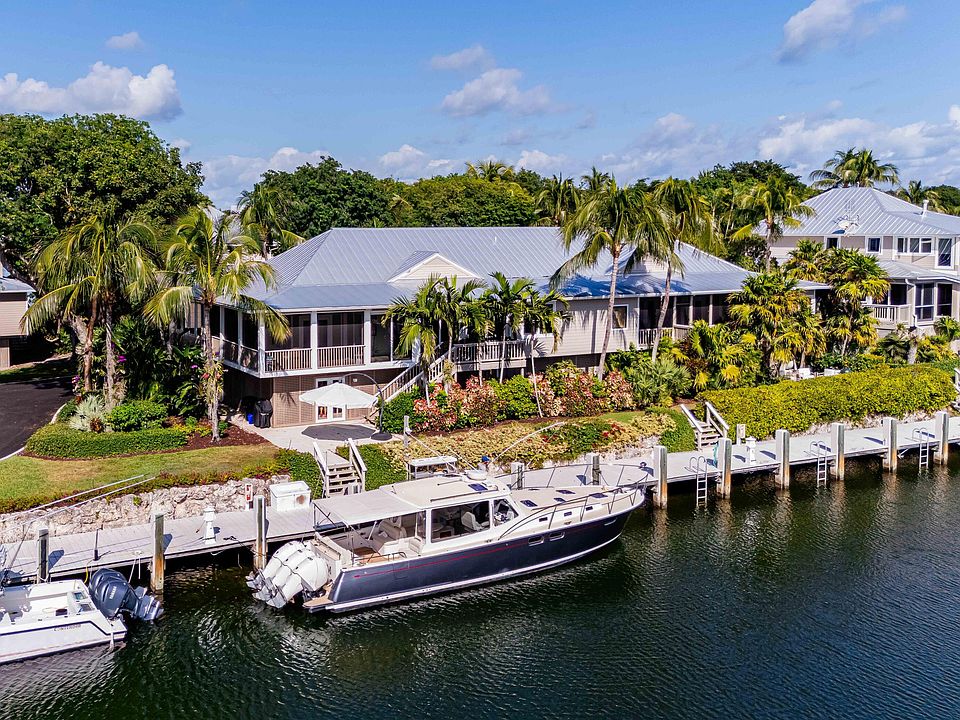Set within the private gates of the Key Largo Anglers Club, this beautifully renovated cottage captures the essence of refined Keys living. Sweeping sunset views stretch down the canal toward Card Sound Bay, and a nearby dock accommodates a boat up to 42 feet--perfect for effortless days on the water. The residence features three bedrooms and three baths, anchored by a contemporary kitchen with custom cabinetry, quartz surfaces, Jenn-Air and Bosch appliances, and a dedicated wine cooler. The primary suite is a serene retreat, offering a spa-style bath with double marble vanities, a large walk-in shower, generous closets, and an adjoining study ideal for an office or private lounge. Guest bedrooms each include en-suite baths for comfort and privacy. Soaring ceilings, porcelain tile flooring, and a screened patio with electric roll-down sunshades create seamless indoor-outdoor enjoyment. Below, expansive covered parking provides space for vehicles and golf carts, along with abundant storage and a workshop. Framed by manicured tropical landscaping and vibrant orchids, this fully furnished home is move-in ready--a rare blend of elegance, ease, and true Keys charm.