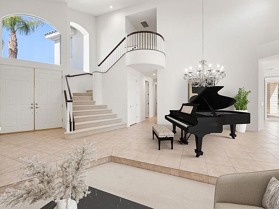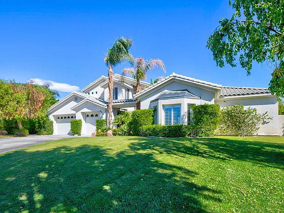If you've been searching for a beautiful, 5BR, 4.5 BA home, search no further. This wonderful Emperor Model Floor Plan in the privately gated community of Victoria Falls offers over 5,000 sq ft of open, spacious living with quality appointments throughout. A commanding circular staircase anchors the formal entry. A large dining area, living room, sunken bar and family room with fireplace all flow together to create a comfortable and inviting space for family time and entertaining guests. Multiple windows and three sets of sliding glass doors all with white plantation shutters are prominent throughout the entire space. The Primary Retreat, on the main floor, is very spacious and features a fireplace, two huge walk-in closets, a spa like en suite, and adjacent retreat/office/workout space or sitting area with double French doors opening to a private side patio. A wonderful kitchen with upgraded granite, under-counter lighting, stainless appliances including two side-by-side Sub-Zero refrigerators, and walk-in pantry opens to a cheery breakfast area and den/family room. A bedroom with private entry and en suite is conveniently located off the den/family room. Upstairs, there are three additional bedrooms, two bathrooms plus a built-in hall cabinet with laundry chute and abundant storage. The fabulous backyard features a pool, spa, built-in BBQ and lots of grassy play area. This is the ultimate Executive Home with a 3 car garage on .44 Acres in the Heart of Rancho Mirage.