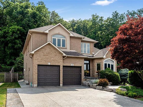 Custom built in 2003 and nestled beneath the Niagara Escarpment on a quiet crescent, this meticulously maintained 4+1 bedroom home offers breathtaking views and a tranquil, cottage-like setting. Soaring ceilings, oversized windows, and rounded corners add elegance and natural light throughout. The freshly painted interior features new kitchen appliances with gas cooktop option, all under a 5-year warranty. The spacious primary bedroom features a two-sided gas fireplace shared with the spa like ensuite creating the ultimate retreat. Walk-in closets in every bedroom, central vac, RO water at all sinks, and two fruit cellars enhance everyday living. The finished basement with 9ft ceilings, separate entrance, and roughed-in kitchen offers in-law or income potential. Step outside to a pie-shaped private lot backing onto lush green space with a multi-tiered waterfall and hot tub—a true backyard oasis. The oversized exposed aggregate driveway fits 6 cars. Move-in ready and surrounded by nature, this home combines comfort, luxury, and lifestyle in one exceptional package.