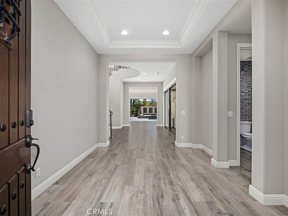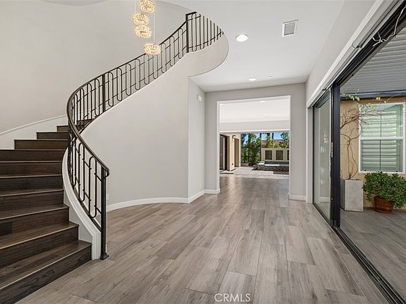 Model-perfect Baker Ranch rental with resort-style pool and spa rarely available! This stunning 5-bedroom, 5.5-bath home spans a premium 6,283 SF private lot with no rear neighbors, offering ultimate privacy and luxury. Step into a grand foyer with a sweeping custom staircase and dazzling chandelier, all seamlessly controlled by a full smart home system. The expansive living room impresses with a designer accent wall and built-in surround sound. The chef's dream kitchen features an oversized island beneath a custom chandelier, professional-grade Wolf appliances, Sub-Zero refrigeration, and upgraded cabinetry plus a separate large prep kitchen with premium stainless steel appliances. Upstairs, a spacious bonus room with built-in cabinetry and a charming Juliet balcony offers versatile living space. The luxurious primary suite is a true retreat, complete with his-and-hers custom walk-in closets, a spa-inspired bath with dual vanities, a deep soaking tub, elegant tile flooring, and full-height stone walls. A private yoga/gym room with its own balcony completes this serene escape. Four additional ensuite bedrooms feature upgraded bathrooms, while premium porcelain travertine flows throughout the downstairs and rich hardwood graces the upper level. Entertain effortlessly with 90-degree stacking doors that open to a breathtaking backyard oasis: a sparkling oversized spa, a dramatic firepit wall, built-in BBQ with sunken seating, a courtyard bar, and an electric pergola for shaded alfresco dining. Owned solar panels help reduce energy costs. Enjoy exclusive Baker Ranch amenities including resort pools, spas, lounge areas, and scenic trails. Conveniently located with easy access to the 133 freeway and premier shopping. This is luxury rental living at its finest!