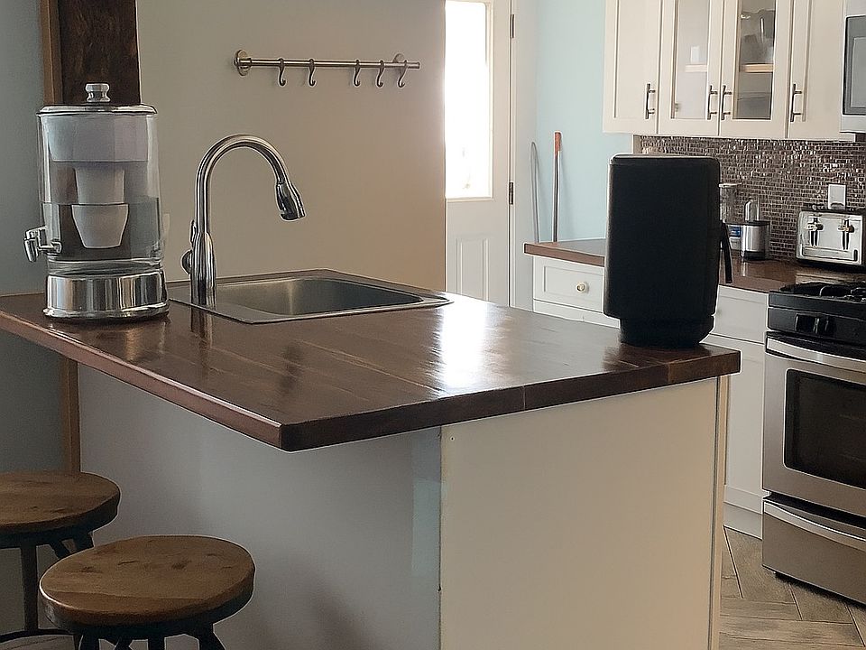 Private backyardStainless steel appliancesWood countertopsBright white cabinetsUpdated kitchen