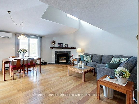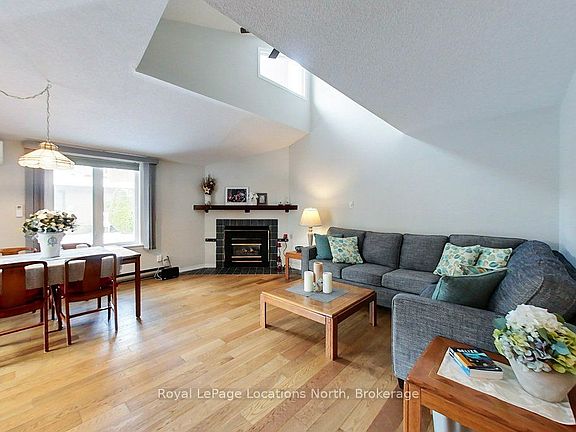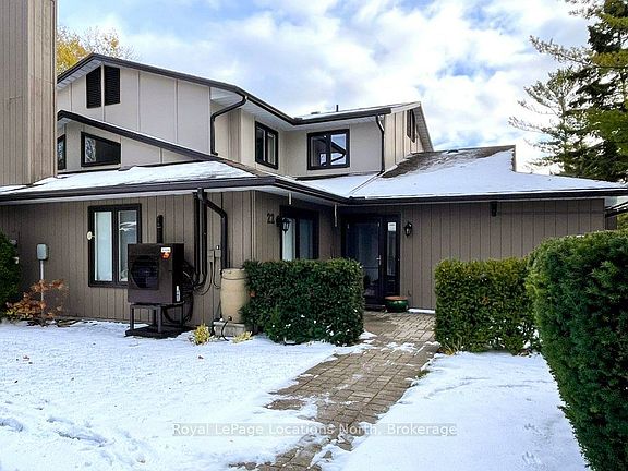 Spacious, two-storey 3 bed/ 3 bath condo in the heart of Ontario's Four Season Playground! This large corner unit offers privacy and lots of natural light. Enter into the front foyer with double closets and ample space when bringing in your gear and groceries. The inviting, open plan living area features a vaulted ceiling, hickory wood floors, gas fireplace, walk out to private patio and a handy two-piece guest bathroom. You'll find the kitchen tucked away off the main living area and the laundry, pantry and storage closets a few steps away. The oversized, main floor primary suite boasts two large windows, seating area, walk in closet and a four piece ensuite. Upstairs, two additional bedrooms, one being a loft style and a three-piece bathroom offer an ideal layout for kids or guests. Step out to you private patio enclosed with attractive hedges and mature trees. There is a handy outdoor storage cupboard and private parking space/s directly outside the unit. There are multiple heat pumps/AC units, as well as the gas fireplace to keep you comfortable in all seasons. Electric baseboards were not removed. Minutes to the amenities in Collingwood, Georgian Bay, ski hills and golf.