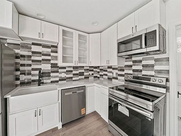 This first-floor 2BR/1.5BA unit was gutted to the studs and fully renovated in 2025, making you the very first resident to enjoy the upgrades. The kitchen features quartz-style countertops, a farmhouse sink, and mostly new appliances, while the open living and dining area shines with hardwood-style floors and recessed lighting. The spacious master bedroom includes a private half bath with sliding barn door, and the modern full bath offers sleek tile, matte black fixtures, and a brand-new vanity. A bonus sunroom/mudroom with its own entrance adds flexible space for an office or lounge. Additional perks include in-unit washer and dryer, two off-street parking spots (one carport), private entrances, and a backyard with a charcoal grill.