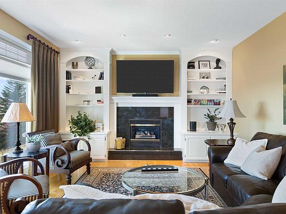 Backing onto the 16th hole of The Hamptons Golf Course, this meticulously maintained, single-owner walkout home offers nearly 4,000 sq. ft. of developed living space. Enjoy unobstructed east-facing sunrise views over the fairway, pond, and city, plus night-time city lights. The main floor features an open-concept kitchen, dining, and family area with gas-burning fireplace, main floor den with built-in cabinetry, and an upper deck with frameless glass railing and two gas connections for flexible outdoor living. The kitchen includes Sub-Zero 36” built-in fridge/freezer, Wolf 30” dual-fuel range, Panasonic microwave, Miele dishwasher, and hood fan, while Hunter Douglas window coverings enhance the main spaces. Upstairs, the home offers four spacious bedrooms, including a primary suite with custom ensuite (2015) featuring a standalone soaking tub, in-floor heating, glass-enclosed shower with rain head, custom cabinetry, and Kohler designer fixtures. TV mounts are in the living room and master bedroom. The walkout basement extends living space with a large office wired for internet and dual phone lines, custom maple cabinetry with media centre and bookcase, second gas-burning fireplace, and additional flex room ideal as a bedroom, gym, or hobby space. Direct access to a large interlocking patio provides private golf course views. An oak standalone bookcase at the bottom of the stairs is included. Other features include LG washer & dryer, two Amana high-efficiency furnaces, central A/C, two water heaters (2025), Kinetico water system, Vacu-Flo system with attachments, updated vinyl-clad windows (2015–2021), oversized two-and-a-half-car garage with large driveway, and a programmable in-ground irrigation system. Located on a quiet street and maintained as a no-pet home, this property combines exceptional design, premium finishes, and a premier golf course setting in The Hamptons, close to parks, schools, walking paths, and convenient access to Stoney Trail, Country Hills Boulevard, and Shaganappi Trail.
