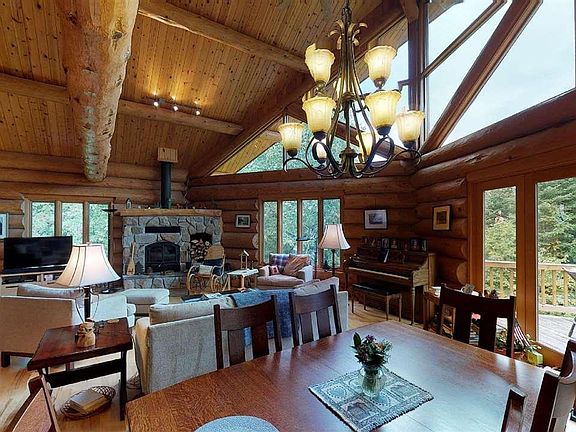 A lake home for the ages! This Lutsen Log Home on Caribou Lake was crafted by Senty Log Homes of Grand Marais in 2006. Large log courses and long runs add a flare of drama and permanence to this lakeside gem. The glass wall prow invites all the moods of the lake and surrounding forest into the home. Massive log purlins fly through the cathedral ceiling. A stone fireplace anchors the living room and creates just the right vibe, especially when the gales of November come early! Four bedrooms one of which is a large lofted space that includes a spacious bathroom. Three bathrooms create plenty of elbow room for family and guests. The kitchen is class-act, with room for everyone milling around visiting the cook and lots of storage in the custom cherry cabinetry. The floors are hickory and toasty with an in-floor heating system. The sprawling deck is the place for family gatherings, BBQ, meals, or just soakin’ in the sun. Screen porch is adjacent to the deck for a more civilized outdoor experience. Plenty of room here, 3200 finished square feet. No need to be right on top of each other. Privacy for guests and several locales could become the home office or craft room. Downstairs is a walk-out family room with plenty of natural lighting entering the bank of windows. Tiled floors downstairs, paneled ceilings, and a gas fireplace. The lakeshore drops off nicely into the cool waters of Caribou Lake. Good place for swimming and deep so the prop won’t get mangled on the rocks. Caribou itself meanders all around its Northwoods neighborhood, with lots of nooks and crannies to explore, fish, ski… whatever your lake interest, Caribou can accommodate. The surrounding forest around the home is mature, diverse and provides a nice buffer for privacy. An ample garage with attic room completes the built environment and compliments any hobby, toy storage or man-cave/she-shed dream that can be imagined. Just about at the end of dead-end White Sky Trail, the home sits on a very quiet lot. Dual-fuel heating system is easy on the pocket book. Superior Hiking Trail is a half mile away, the ski hill and golf course 15 minutes. State snowmobile trail, just up the road. BWCA very close. This is a dreamy kind of place: the old log ways from time immemorial combined with contemporary methods of soaring glass, state of the art appliances, and fiber optics. Northwoods Modern!