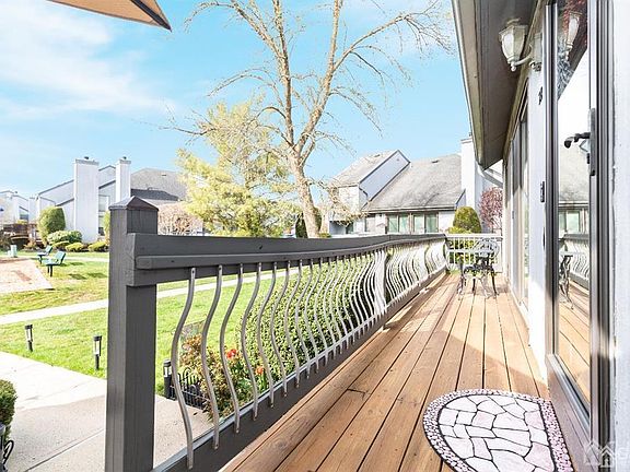 This bright and open corner unit in Southridge Hills is not to be missed! 2 bedrooms, 2.5 baths with hardwood floors throughout, a full, partially finished basement and 1 car garage in a highly sought after community, located directly across from the playground. You enter off the front porch into the grand 2 story living room, with wood-burning fireplace, nicely updated with tile surround and white mantle. Step down into the eat-in kitchen with white cabinetry, all new stainless steel appliances and matching backsplash plus a pantry for additional storage. Sliders out to the front deck. Adjacent to a large formal dining room. Also on this level a powder room, mudroom/laundry room with coat closet and garage entrance. 2nd level features a large master bedroom with custom window treatments, private balcony, 2 closets and en-suite full bathroom. Also upstairs, a second bedroom, also with a private balcony, common full bathroom and a huge loft area, perfect for an office or family room, overlooking the living room. Ceiling fans in both bedrooms and the loft. The full basement is partially finished with tons of space for a rec room, plenty of storage & utilities. Security system with connected cameras included. Each unit has 1 assigned parking space in the lot behind their building, in addition to their private garage. Community maintained by professional management, with fee covering all common area maintenance, exterior maintenance, plus snow & garbage removal. Top rated schools, very close to NYC bus, and only 15 min to downtown Princeton!
