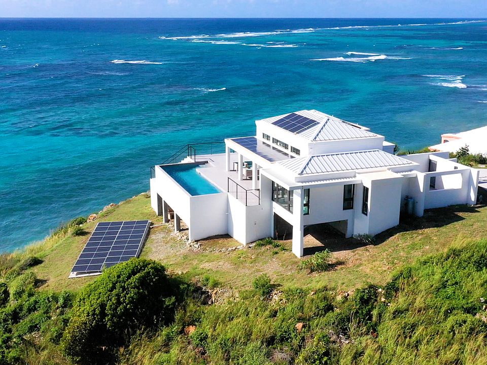 Luxury meets sustainability in this beautiful new build on St Croix's South Shore. Boasting an array of high end finishes and a thoughtful layout, this immaculate 2 bedroom 2 bath villa lays claim to unobstructed panoramic views of Rod Bay, the sparkling sapphire sea, and glorious sunsets. The gated concrete drive leads to a welcoming entrance featuring a custom walnut pivot door that reveals the breathtaking views of the location the minute you pass through. Inside you will find an open and airy living space and kitchen full of quality finishes such as Mod Cabinetry, Krause stainless sink and faucet, Fisher Paykel appliances, and a quartz covered waterfall island. The indoor living area blends seamlessly with the alluring outdoor veranda that gives center stage to a 33' saltwater lap pool and an additional 1500 sf of space to dine, relax, entertain, and take in the amazing vistas of the surroundings. The ensuite bedrooms open onto the veranda and offer a tranquil space to retreat after a day of island living. On the lower level of the home you will find a spacious garage that is accessible from the driveway or from the veranda. The garage has ample storage and workshop space, and houses the on demand water heater, pool pump, water softener, 12k back up generator, and the equipment for the 36 panel Holloway Solar system that allows the home to be COMPLETELY OFF GRID. Other features of this impeccable home include hurricane impact doors, sliders and windows, Koala grey marble plank flooring throughout, walnut butcher block bathroom counters, custom solar powered aluminum gate with walnut inset panels, and solar landscape lighting that illuminates the beautiful landscaping that is sprinkled with palms, aloe, agave, desert rose, sea grapes, Frangipani, bougainvillea and pineapple plants, just to name a few. Please see amenities list in documents.