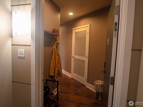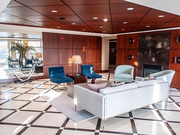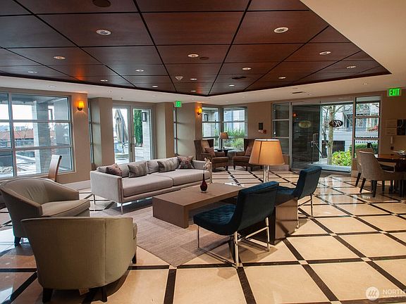 Picture yourself in this upscale downtown corner condo, just steps from shops, dining, beach, marina & employers such as Google. Generous kitchen w/ slab granite counters & breakfast bar overlooks light-filled Great Room with partial view of Lake Washington. Relax by the gas fireplace in winter or on the private balcony in warmer months. Primary suite has full ensuite bath and walk-in custom closet. Second bedroom/home office has fold-down bed. Another full bath & utility closet are off the hallway; marble tiling in both baths. Common amenities include fitness center, package room & patio with seasonal firepit. Unit has 2 adjacent spaces in secure garage. Dues include quake insurance and many utilities. New roof and elevator; well-run HOA!