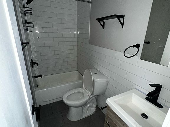 Bathroom Recently updated with sleek tile work, full bathtub/shower, and a contemporary vanity with storage.