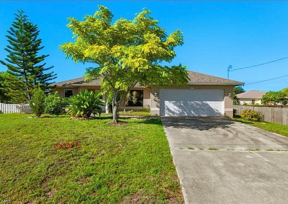 Welcome to this charming 3-bedroom, 2-bathroom single-family home located in the desirable Mirror Lakes community. featuring an open floor plan with cathedral ceilings, elegant marble and tile flooring, and plenty of natural light throughout. The modern kitchen includes a breakfast bar, while the spacious master suite offers a relaxing retreat with a separate shower and tub. Situated on a 0.29-acre lot with a serene wooded area view, the property boasts a large patio, privacy wall, fruit trees, and an additional building for storage or hobbies. The attached 2-car garage and fenced yard add convenience and functionality. Built in 1999 with a durable concrete block design and shingle roof, this move-in-ready home is located in a peaceful, non-gated neighborhood with no HOA fees, close to schools, shopping, and dining. This is a fantastic opportunity to own a beautiful home in Fort Myers—schedule your showing today!