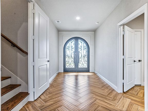 Step inside this brand new, stunning 4-bedroom, 3-bath Brahman Ranch home, where a gorgeous iron front door leads to a great room with wooden beams and a decorative fireplace. The gourmet island kitchen shines with granite counters, custom cabinetry, stainless steel appliance package, electric cooktop and walk in pantry. The thoughtful floor plan is perfect for modern living, featuring a secluded primary bedroom suite on the main floor. The spa-like primary bath is an indulgence in luxury, with dual custom-cabinetry sinks, a standalone soaking tub with elegant tile surround, and a spacious walk-in shower. Two additional bedrooms on the first floor offer convenience, while a private fourth bedroom and full bath upstairs serve as an ideal guest retreat or bonus space. Outside, the covered patio overlooks a generous backyard, and a relaxing view of the neighborhood pond - creating a perfect setting for outdoor living.
