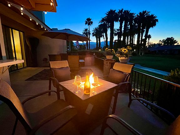 OUTDOORS -- The patio features a four burner BBQ, dining table for six with umbrella, fire feature and patio heater for the cooler nights. Rolling ice chest and solar powered patio lights complete the space. The community pool and spa located less than 300ft from the unit!