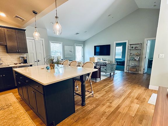 Private deckStainless steel kitchen appliancesOpen floor planRecessed lightingDecorative back splashHigh ceilingsSelf closing custom cabinets