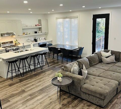 Double laundry machinesModern open concept kitchenDen with walk-in pantryTwo full-size fridgesWalk-out deckNatural gas bbqLarge backyard