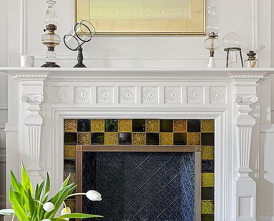 Inside, the home stuns with nearly 10-foot ceilings, original parquet floors, and intricate moldings throughout. The grand living room is anchored by a beautifully preserved fireplace framed in hand-glazed tile. Natural light pours through eight windows, accentuating the crisp architectural lines and historic textures. The dramatic turret dining alcove, wrapped in floral wallpaper and curved bay windows, offers an unforgettable setting for morning coffee or evening meals.