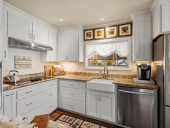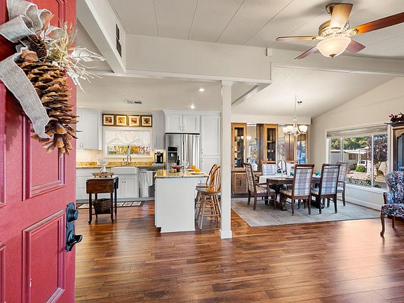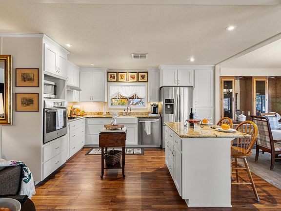 Discover this beautifully remodeled 2-bedroom, 2-bath, mobile home of 1,440 sq. ft. home nestled in the desirable Murphys Diggins Estates, a peaceful senior community in the historic Gold Rush town of Murphys. Step inside to a bright, open floor plan featuring new hardwood flooring, crown molding, and oversized windows that fill the home with natural light. The great room showcases a cozy gas fireplace with floor-to-ceiling stacked rock surround, creating a warm and inviting space for entertaining. The completely remodeled kitchen is a showstopper with a farm style sink, new white cabinetry with full wood boxes and faces, granite countertops, a large island. Both bathrooms have been updated to match the home's modern, elegant feel. Enjoy the privacy of mature landscaping on a flat lot and driveway easy to access and well maintained, with no tree root issues. Additional highlights include: Large primary suite with walk-in closet and remodeled bathroom with Granite Counters. Spacious laundry and utility room Two well-maintained sheds/workshops for extra storage Central Heat and A/C. Roof clearance. Walk to the well-equipped clubhouse complete with Swimming pool, Spa/Jacuzzi, Sauna, fitness Room, and Billiard Room. This home is move-in ready for the holidays perfect for those seeking low-maintenance living in a friendly, walkable community just minutes from downtown shops, wine tasting, and restaurants. Don't miss out this one is a true gem in the heart of the gold country!